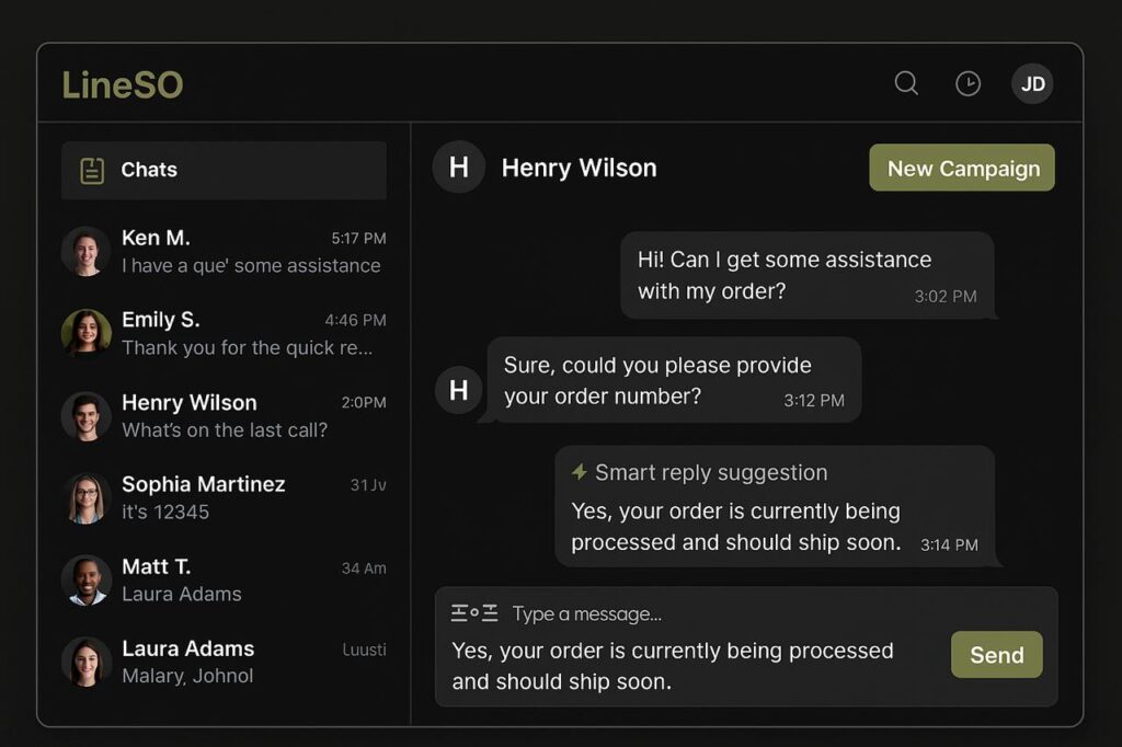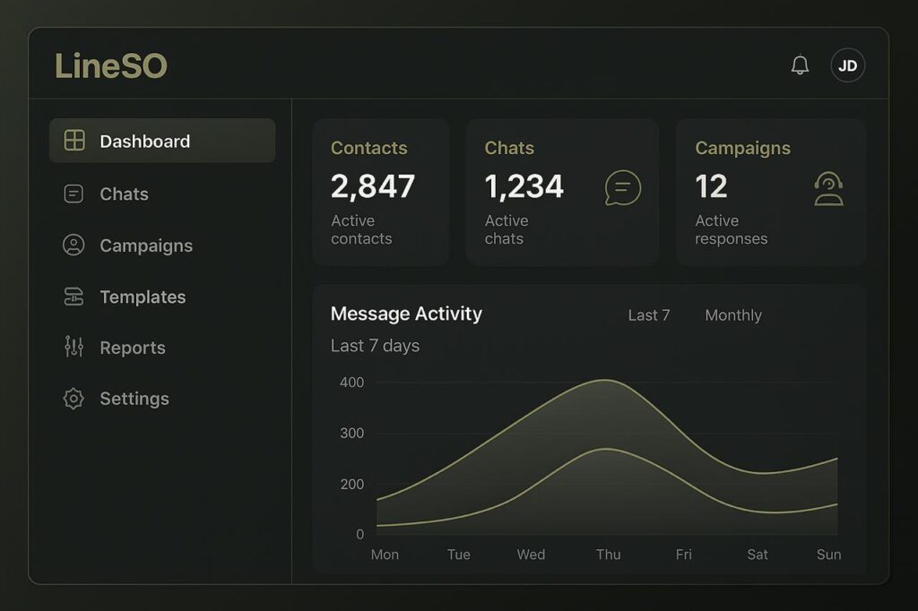 LineSO – حلول اتصالات ذكية تربط شركتك بعملائك نقدم خدمتين رئيسيتين: منصة واتساب رسمية للتسويق وخدمة العملاء، وخدمة سنترالات (Grandstream) مع تركيب وتشغيل.اختر طريقك وابدأ الآن. جرب منصة واتساب شاهد حلول السنترال ماذا نقدم؟ حلول عملية تجمع بين SaaS الرسمي من Meta وأجهزة اتصالات مؤسسية. منصة واتساب (SaaS) قوالب رسمية، حملات، Chatbot وAI، إدارة فريق وتقارير. سنترالات Grandstream IP-PBX وهواتف IP مع تركيب احترافي وربط فروع. تكامل وتقارير Webhooks/API، لوحة تقارير للمكالمات والرسائل. دعم وتشغيل تفعيل، تدريب الفريق، ودعم عربي موثوق. الحلول الرئيسية Whatsupp Business API أدر محادثاتك وحملاتك من منصة واحدة، وفعّل الردود الذكية والتقارير. تفاصيل الخدمة حول السنترال والكول سنتر حلول IP-PBX، IVR، تسجيل مكالمات، رقم موحد، وربط فروع آمن. تفاصيل الخدمة لماذا LineSO؟ نوازن بين السحابة والهاردوير لنقدّم تجربة تشغيل مستقرة وسهلة. تكامل كامل نربط الأنظمة والواجهات لتسهيل التشغيل اليومي. تقارير وتحليلات CDR وتقارير رسائل تساعدك تقيس الأداء وتطور الفريق. جودة موثوقة أجهزة Grandstream ومنصة مدعومة رسميًا من Meta. دعم فني تفعيل سريع، تدريب، واستجابة فنية مستمرة. أرقام تثق فيها شركة تستخدم حلولنا + 0 رسالة يوميًا +k 0 رضا العملاء % 0 دعم فني 7/ 0 جاهز تبدأ؟ اختر الحل المناسب لك وابدأ خلال دقائق. جرب خدمة واتساب اطلب عرض للسنترال